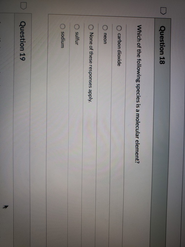 Which of the following species is a molecular element. A neon B sulfur C chlorine D carbon dioxide E none of the above 10 Choose the pair of names and formulas that do not match. Then we have ah molecular formulas.
